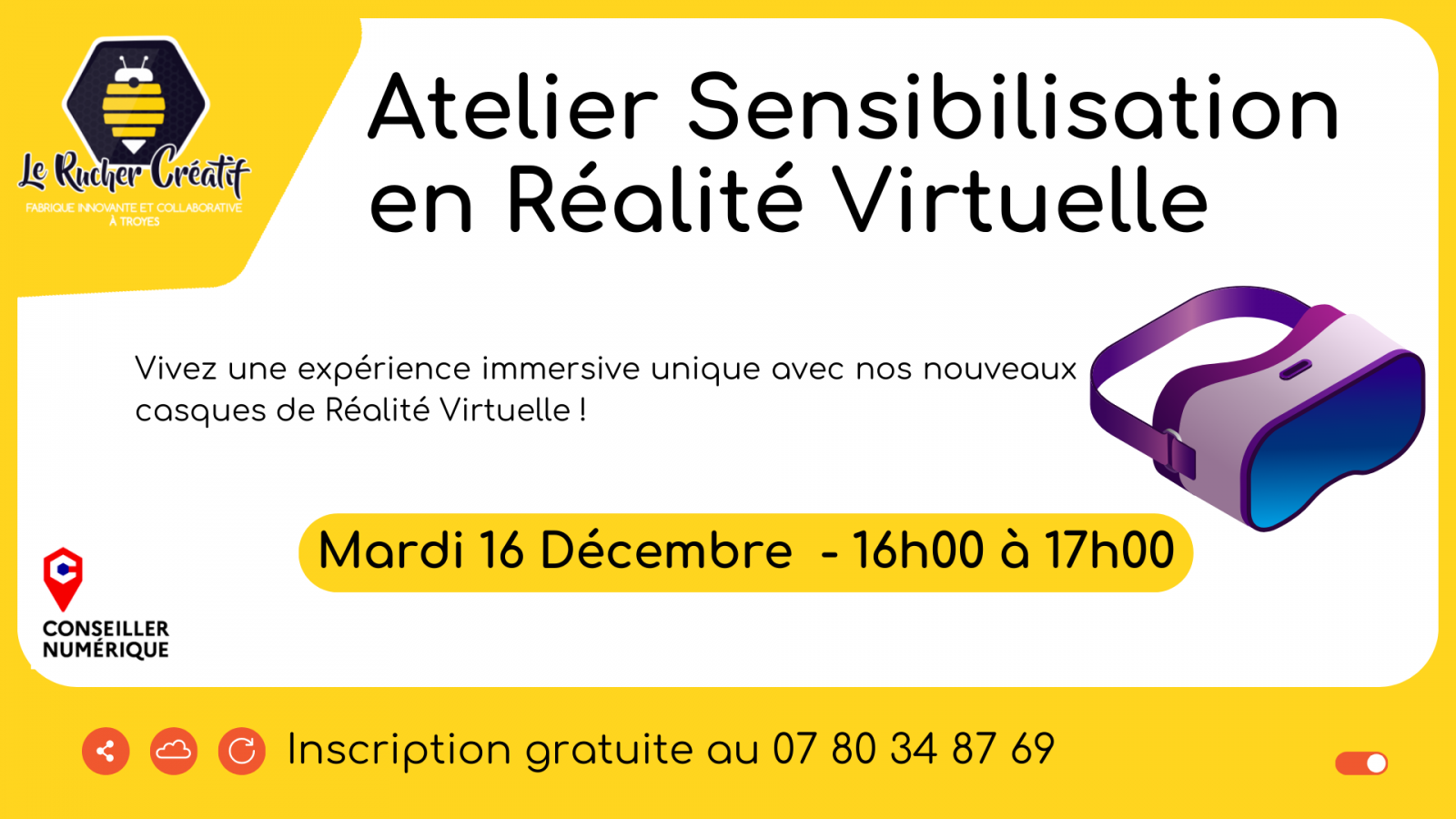 Apertura Tarifas Prestaciones Volver a la lista Apertura El 16 diciembre 2025DíaHorariosMartes 16h00 à 17h00 Tarifas Gratuit Prestaciones Tipos Acompañamiento Iniciación / descubrimiento Actividades culturales Realidad virtual