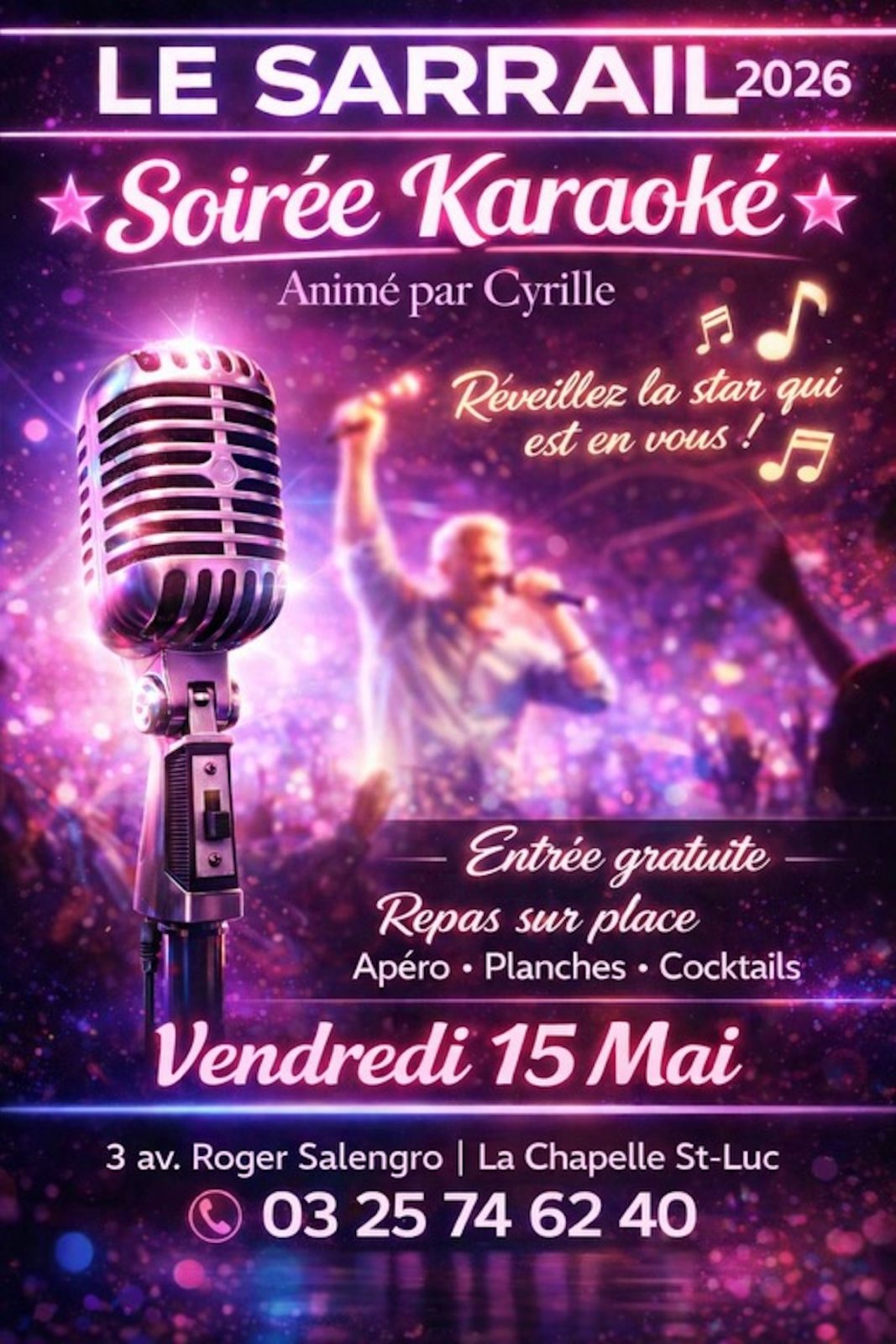 Los 15 may 2026 3 avenue Roger Salengro, 10600 La Chapelle-Saint-Luc Consultar los horarios Fecha Tarifas Prestaciones Ubicación Cerca Volver a la lista Fecha El 15 mayo 2026DíaHorariosViernesA las 19h30 Tarifas Gratuit Medios de pago Tarjeta bancaria/crédito Consulte Cheque Vacaciones Metálico Pago sin contacto Apple Pay Prestaciones Equipos Aparcamiento Aparcamiento gratuito Ubicación