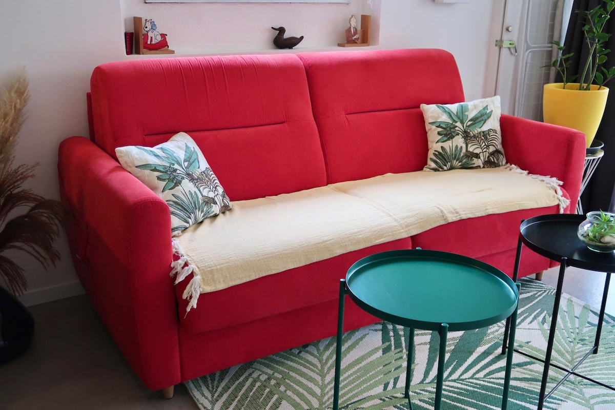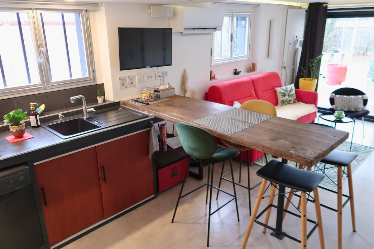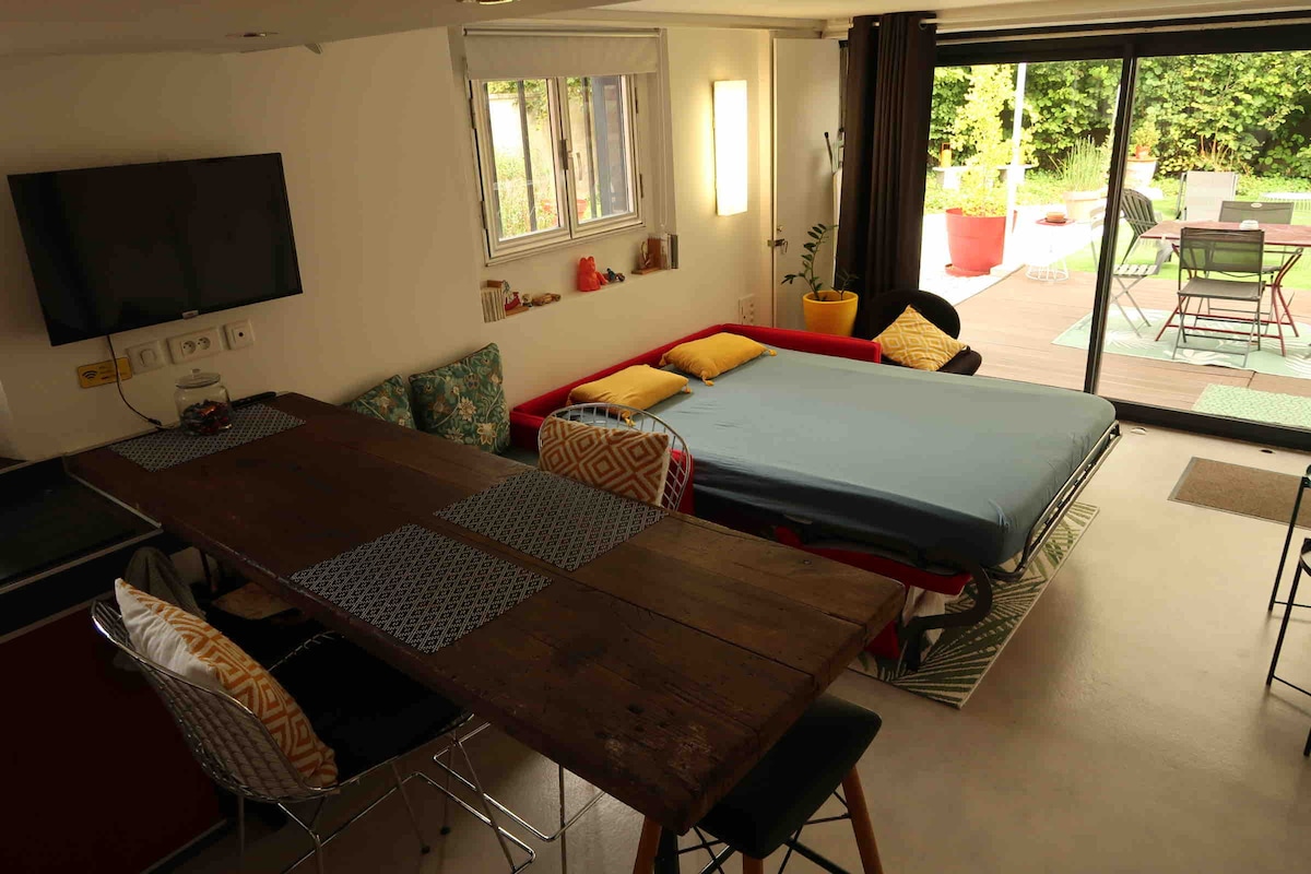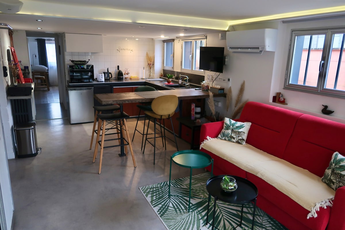 Cama king-size con sábanas y TV de 40 pulgadas, un cuarto de baño (toallas incluidas) con aseo, cocina abierta a un salón con un sofá cama de espuma viscoelástica de buena calidad (1,60 m).