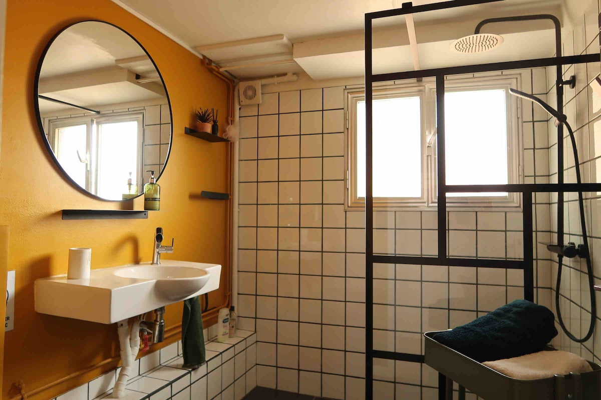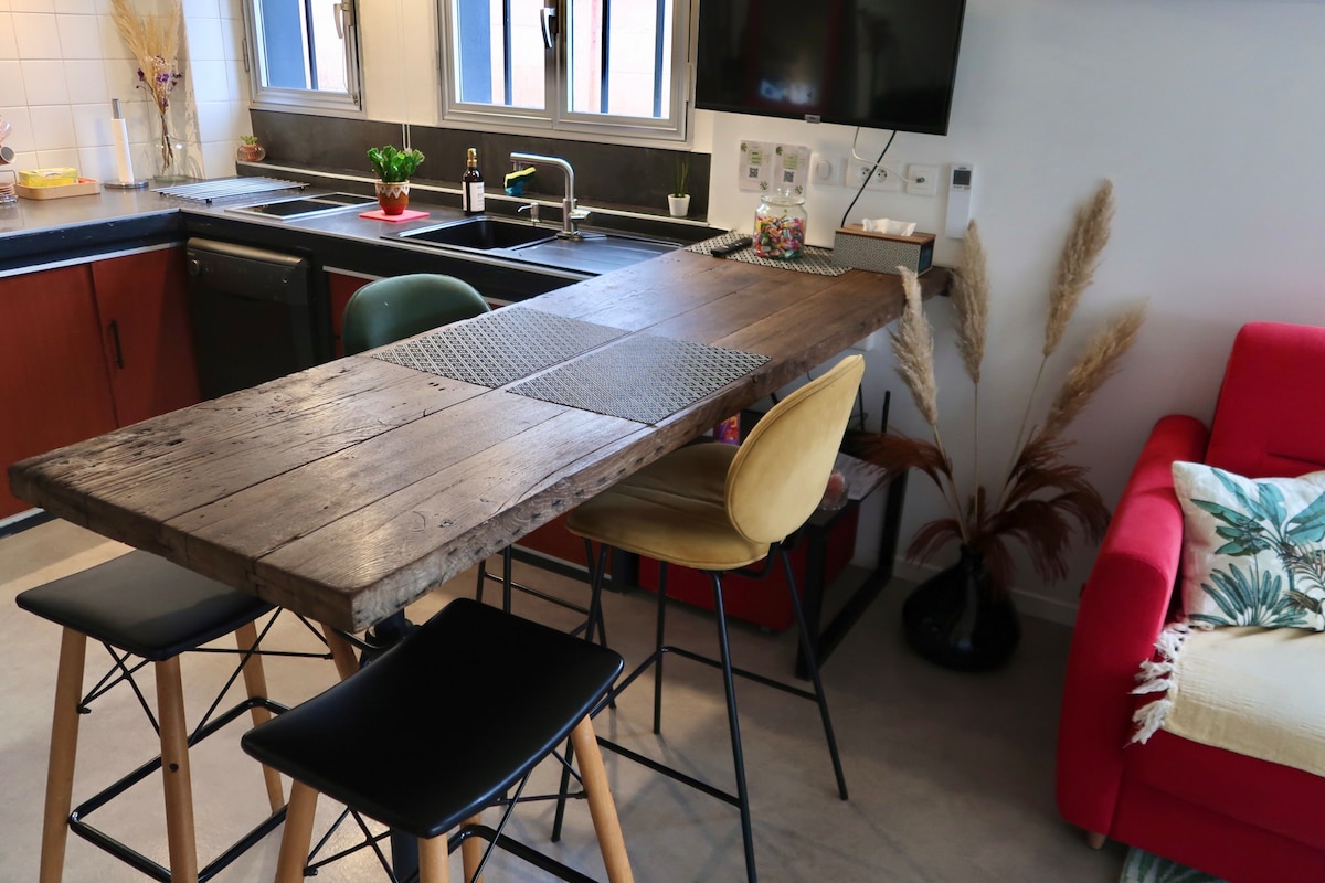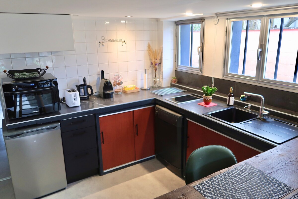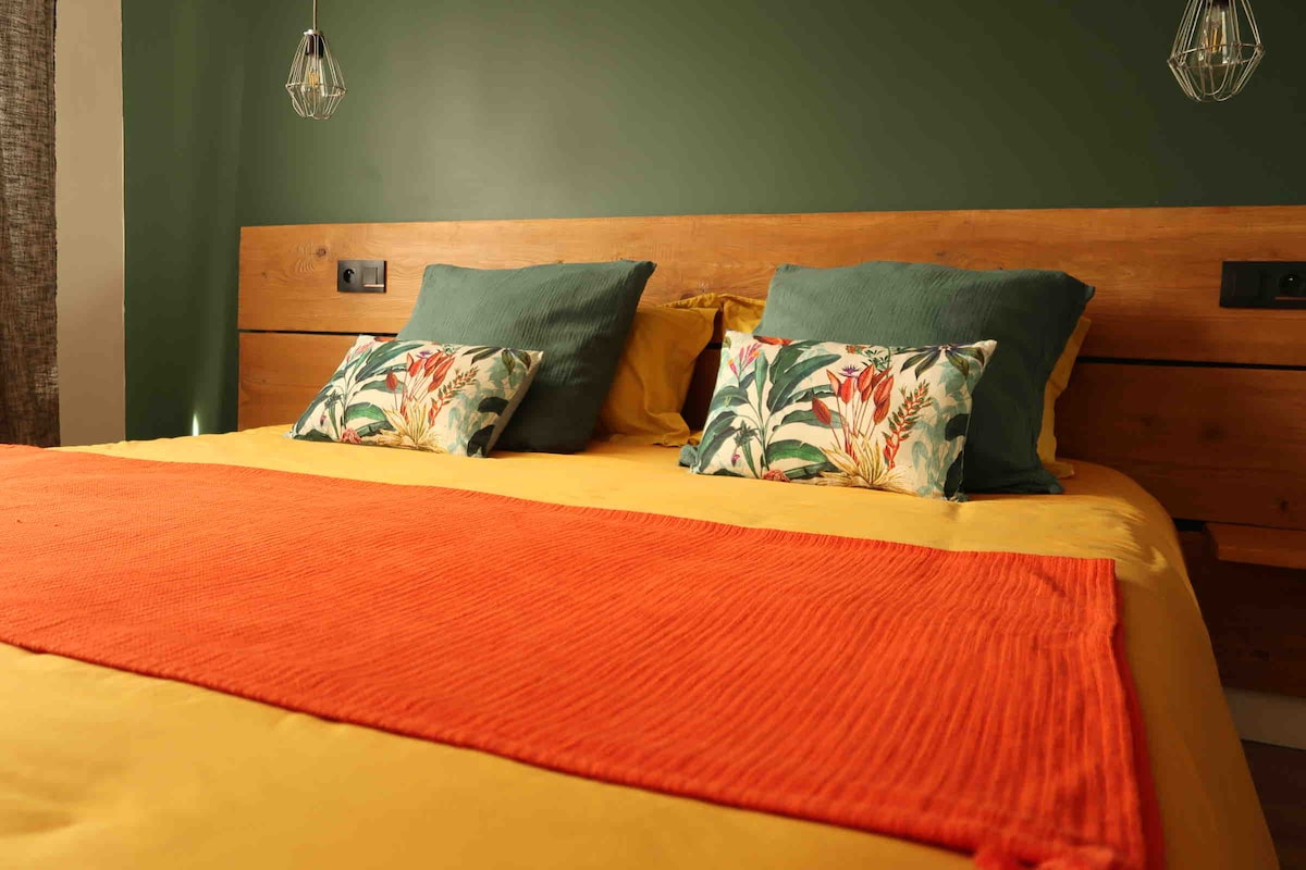Cama king-size con sábanas y TV de 40 pulgadas, un cuarto de baño (toallas incluidas) con aseo, cocina abierta a un salón con un sofá cama de espuma viscoelástica de buena calidad (1,60 m).