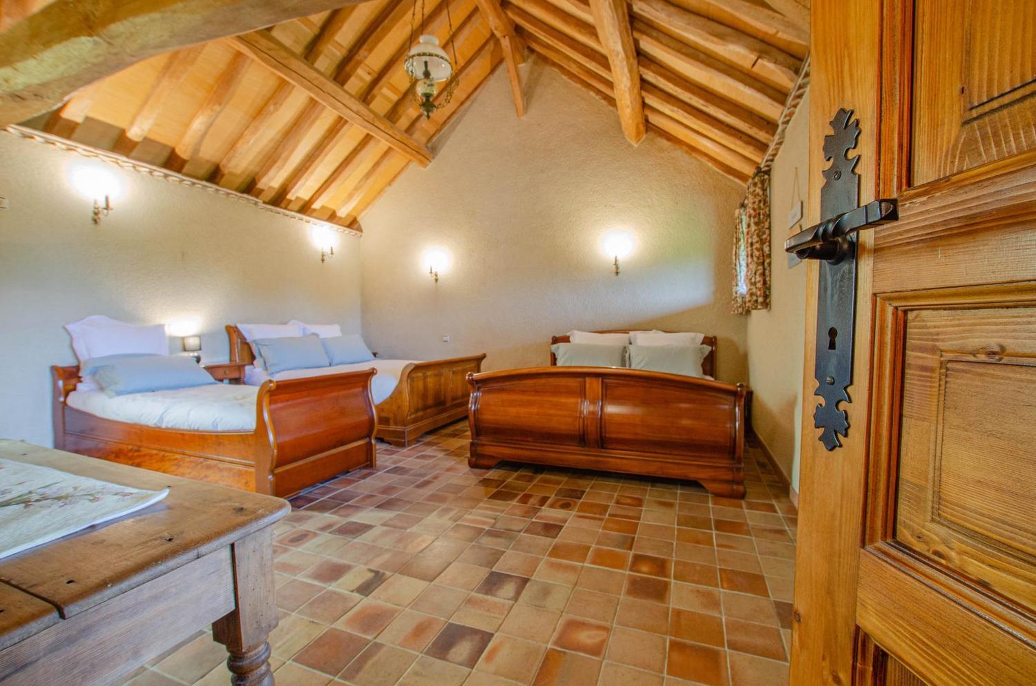 Arriba, hay un dormitorio triple (cama de 140×190 + cama de 90×190), un dormitorio doble (2 camas de 90×190) y un dormitorio familiar (cama de 140×200, cama de 160×200 y cama de 90×190) con televisión. También hay un altillo equipado como salón con sofá y TV, una zona de juegos para niños, un cuarto de baño (bañera + lavabo doble) y WC separado con lavabo.