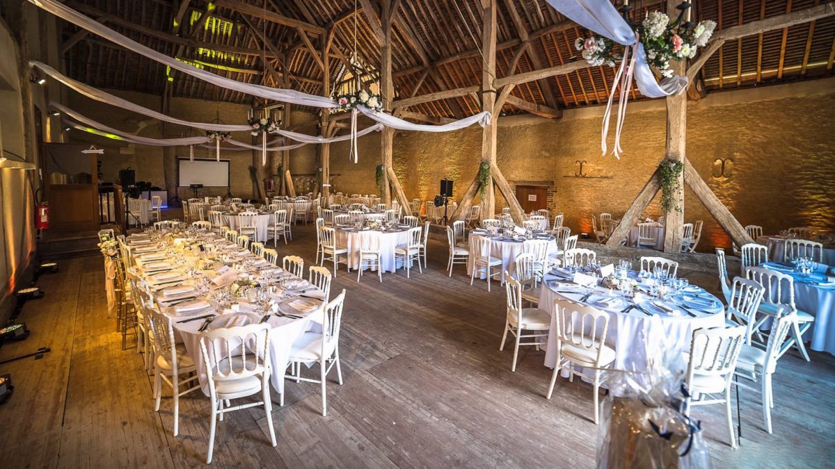 • En el granero (260 m²) hay espacio para celebrar bodas de hasta 240 invitados bajo una sublime estructura del siglo XVIII y candiles de hierro forjado.
